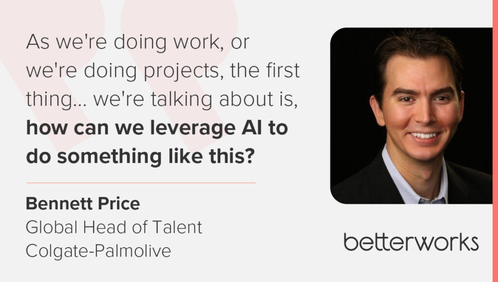 Colgate Palmolive’s global deployment of an AI bot for objective setting, for example, demonstrates how embedding AI within traditional workflows can serve as a catalyst for change. “It can ingest things like your code of conduct, your stance on DEI, in a way that elevates manager capabilities, makes objectives smart and very difficult to break, and starts to eliminate some of the bias,” Bennett said.