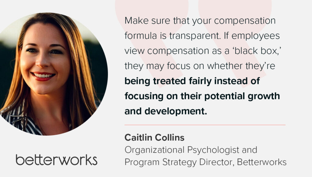“Make sure that your compensation formula is transparent,” says Caitlin Collins, organizational psychologist and program strategy director at Betterworks. “If employees view compensation as a ‘black box,’ they may focus on whether they’re being treated fairly instead of focusing on their potential growth and development.