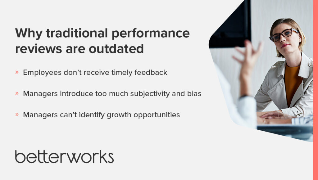 “Let’s say I’ve been doing something wrong for nine months, and you don’t tell me until the end of the year. I could have fixed that nine months ago and been doing so much better in my job,” says Caitlin Collins, organizational psychologist and program strategy director at Betterworks. “And now I’ve created a behavior pattern that’s going to be so much harder to break.”