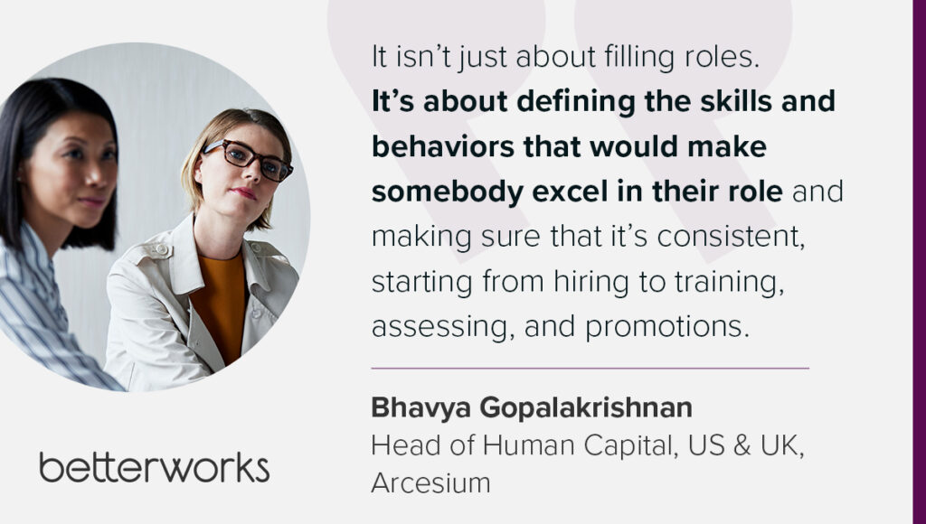 “It isn’t just about filling roles,” Bhavya said. “It’s about defining the skills and behaviors that would make somebody excel in their role and making sure that it’s consistent, starting from hiring to training, assessing, and promotions.”