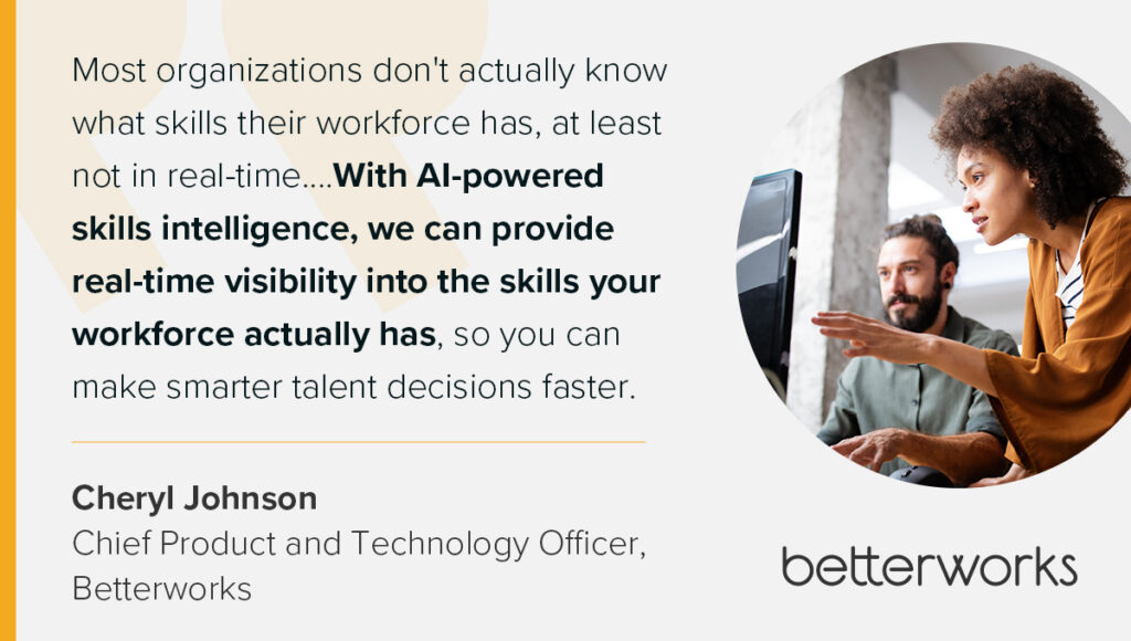 That’s where Betterworks’ AI-powered performance management tools come in. “Most organizations don’t actually know what skills their workforce has, at least not in real-time,” Cheryl said. “Instead, they rely on self-reported skills or incomplete data spread across multiple systems. … With AI-powered skills intelligence, we can provide real-time visibility into the skills your workforce actually has, so you can make smarter talent decisions faster.”