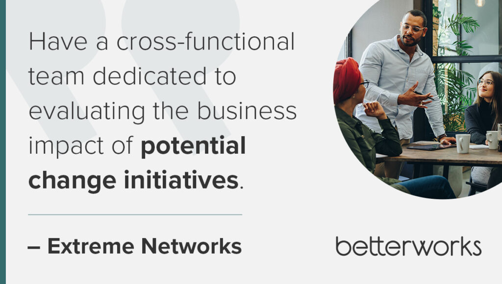 Uniting strategic perspectives from leaders across the organization fosters a holistic approach to decision-making, making sure initiatives are aligned with overarching business goals. This collaboration enhances your organization’s agility and effectiveness when navigating change. That’s why Extreme Networks has a cross-functional team dedicated to evaluating the business impact of potential change initiatives.