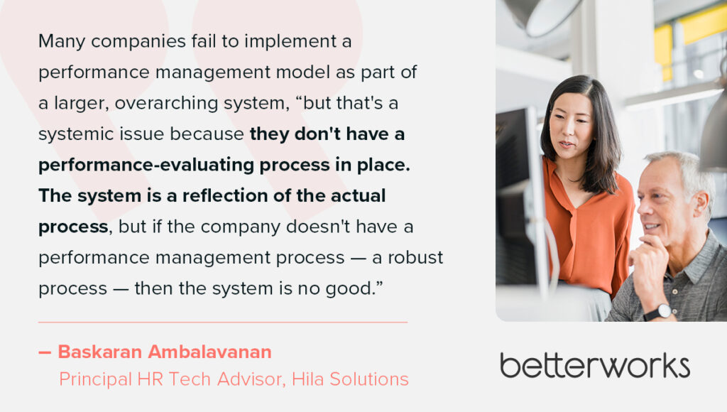 Many companies fail to implement a performance management model as part of a larger, overarching system, “but that’s a systemic issue because they don’t have a performance-evaluating process in place,” Baskaran says. “The system is a reflection of the actual process, but if the company doesn’t have a performance management process — a robust process — then the system is no good.”