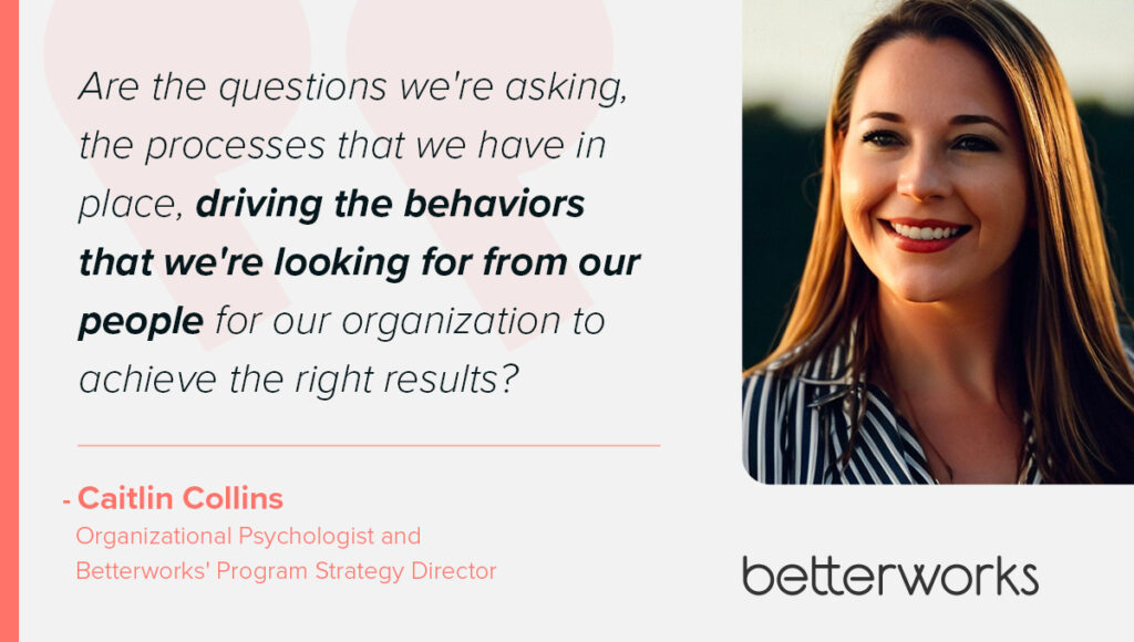 “Are the questions we’re asking, the processes that we have in place, driving the behaviors that we’re looking for from our people for our organization to achieve the right results?” says Caitlin Collins, organizational psychologist and Betterworks program strategy director. If not, consider how to adapt the process to support better goal-setting and equip employees to succeed.