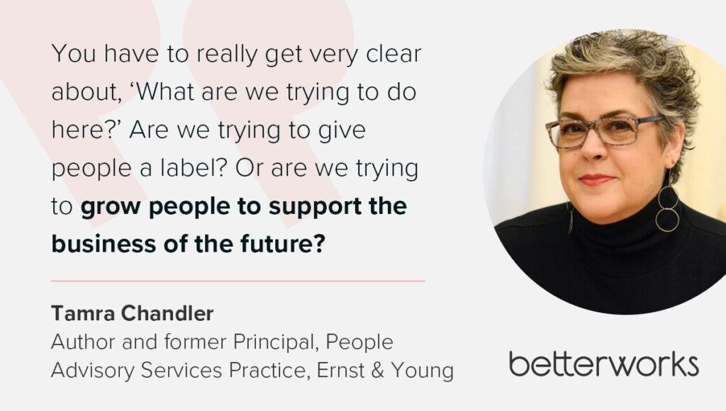 “You have to really get very clear about, ‘What are we trying to do here?’” said panelist Tamra Chandler, author and former talent management services lead for the Americas at EY. “Are we trying to give people a label? Or are we trying to grow people to support the business of the future?”