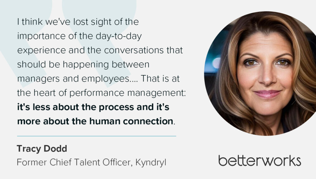 “I think we’ve lost sight of the importance of the day-to-day experience and the conversations that should be happening between managers and employees, whether those conversations are informal or formal,” Tracy said. “That is at the heart of performance management: it’s less about the process and it’s more about the human connection.”