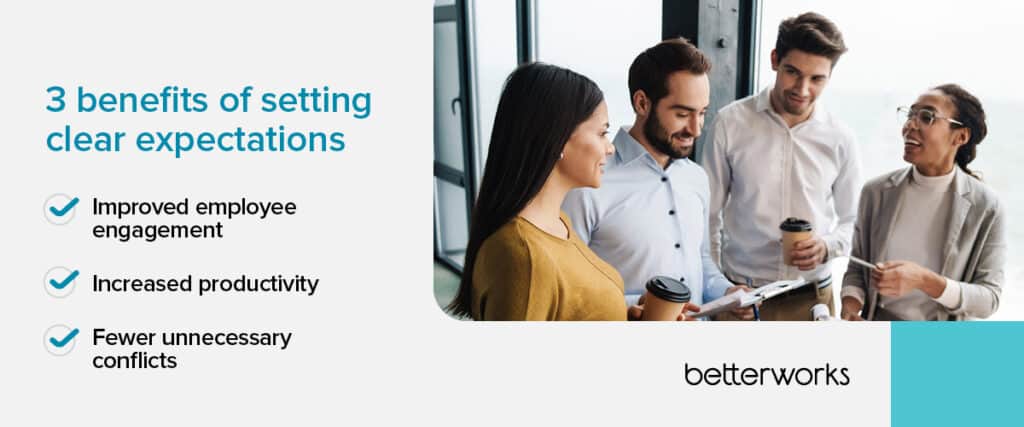 While the benefits of setting expectations for employees are extensive, three key ones are improved employee engagement, increased productivity, and reductions in unnecessary conflict.