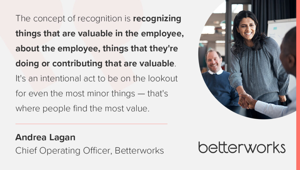 “The type of recognition that we’re talking about here is one where people feel seen and appreciated,” says Betterworks Program Strategy Director Caitlin Collins. “That goes a very long way to really having a happiness quotient at work.”