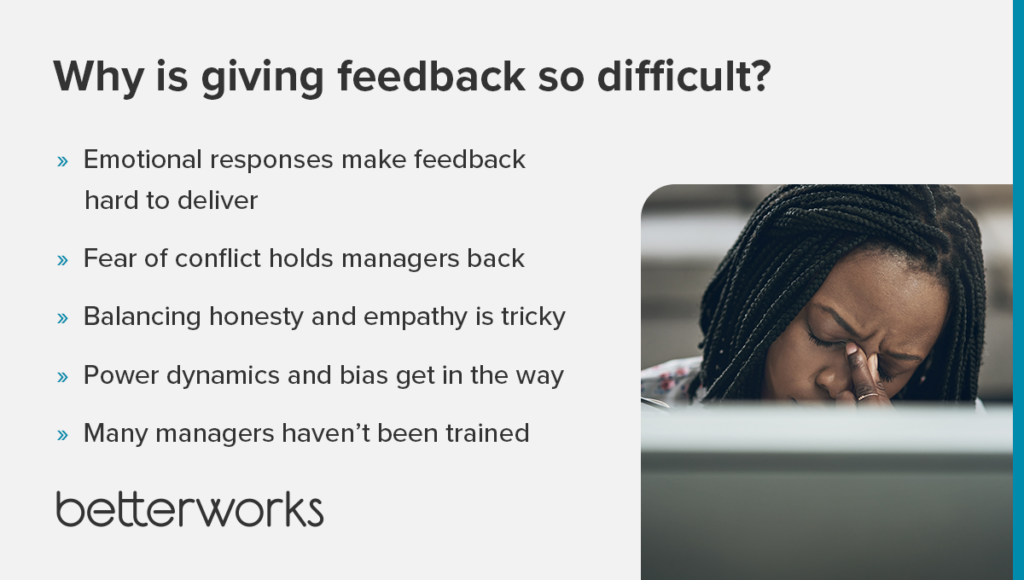 - Emotional responses make feedback hard to deliver. Managers worry about triggering defensiveness or hurting feelings, which can lead to unclear or softened messages.