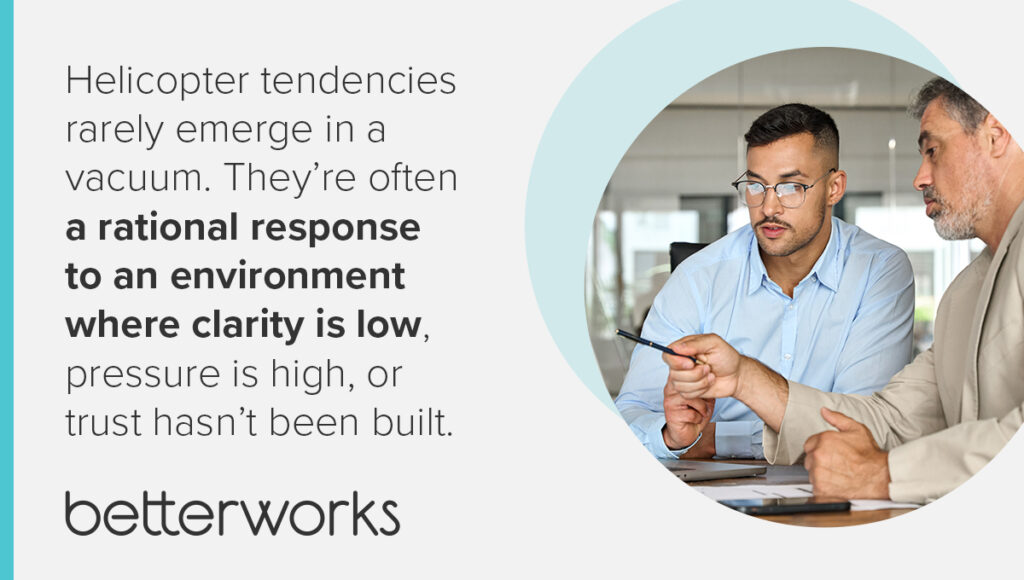 Helicopter management doesn’t always look like overreach. In fact, it often stems from care: managers want to stay helpful, responsive, and present. But in high-pressure environments, that helpfulness can tip into hovering, especially when leaders lack clarity or confidence in what’s expected.
