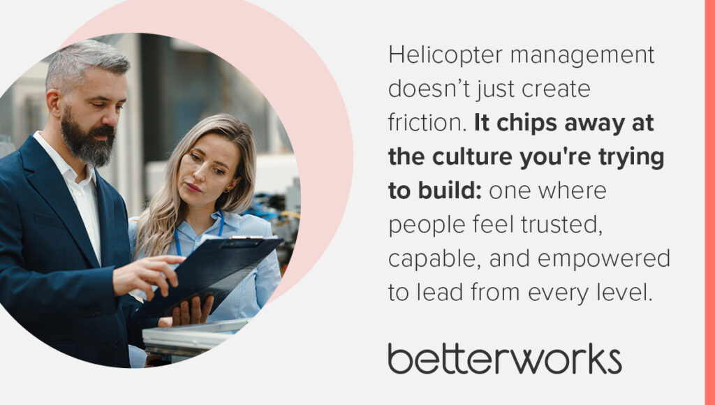 Helicopter management doesn’t just create friction. It chips away at the culture you’re trying to build: one where people feel trusted, capable, and empowered to lead from every level.