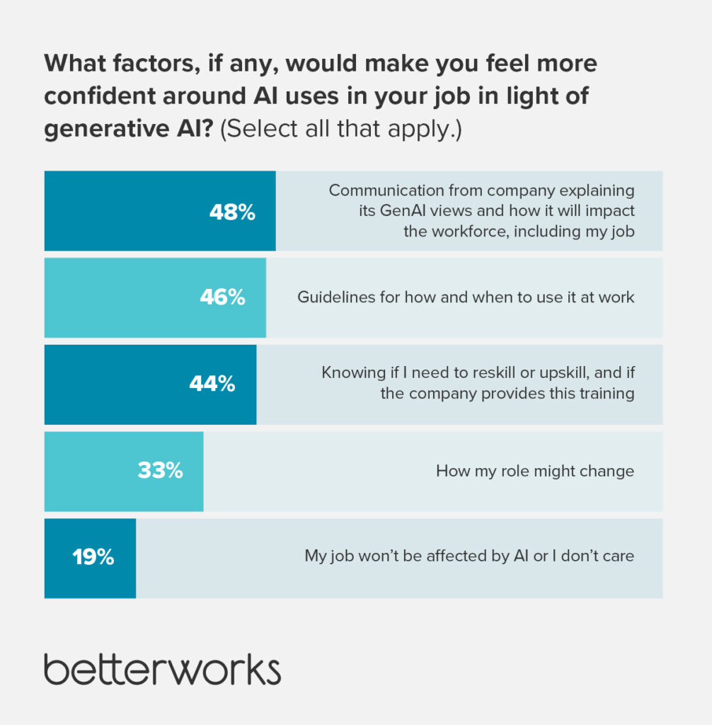 Employees say they also want to hear from HR to better understand how AI will impact their roles and whether and how they will need to upskill. A lack of communication between HR and the workforce can lead to confusion and unnecessary stress.