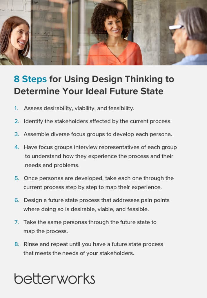 You can’t just have one element, because that’s not necessarily profitable or operationally sound. You could design a process that’s highly desirable for employees, for example, but is it more efficient? Will it increase engagement and retention? Ask questions like these to help address the business case and gain a better sense of what an effective future state looks like.