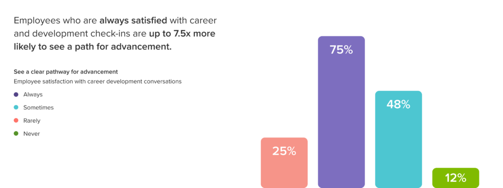 When employees are satisfied with their career and development check-ins with managers, for example, they’re 7.5 times more likely to see a path for advancement within the company, according to our 2023 State of Performance Enablement report. They’re also far more likely to report always feeling engaged and productive. Satisfaction in just one area can have a multiplier effect across the board, improving overall talent outcomes.