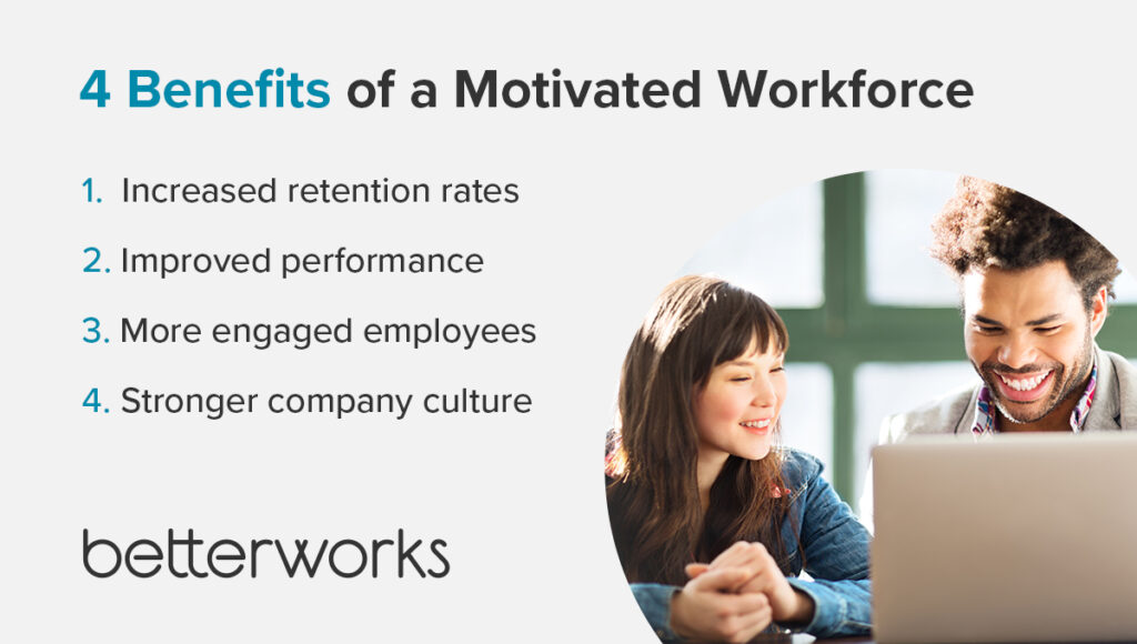 On the flip side, motivated workers are more likely to be engaged. The resulting job satisfaction has a big impact on retention. The steps you’ll take as HR leaders and managers to motivate performance, such as creating visible opportunities for growth and recognizing employees for their achievements, can inspire greater loyalty in your people, influencing retention rates.