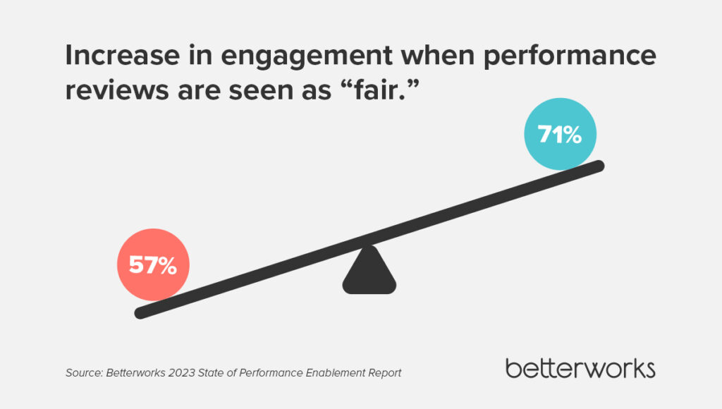 Fair and effective performance reviews play a big role in motivating employees. During our 2023 State of Performance Enablement research, we found that employee engagement rises by 14 points when employees see performance reviews as fair.