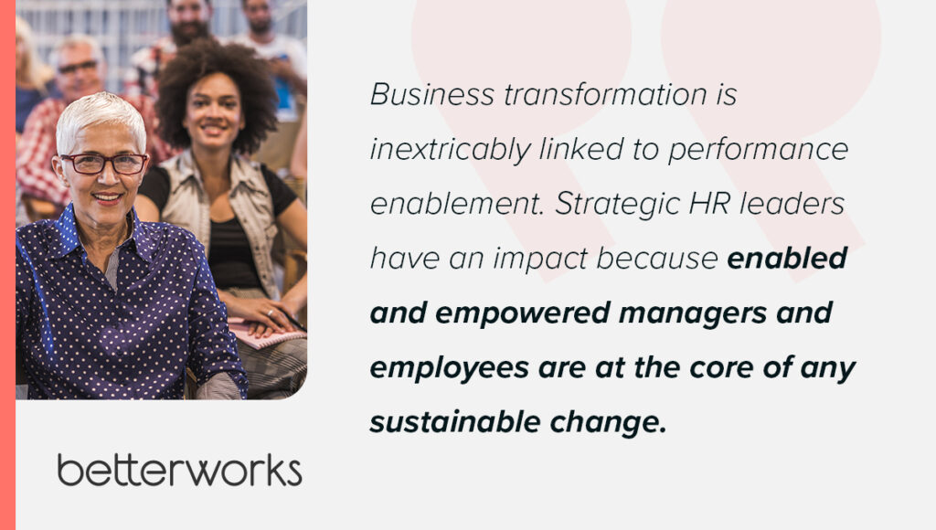 Business transformation is inextricably linked to performance enablement. Strategic HR leaders have an impact because enabled and empowered managers and employees are at the core of any sustainable change.