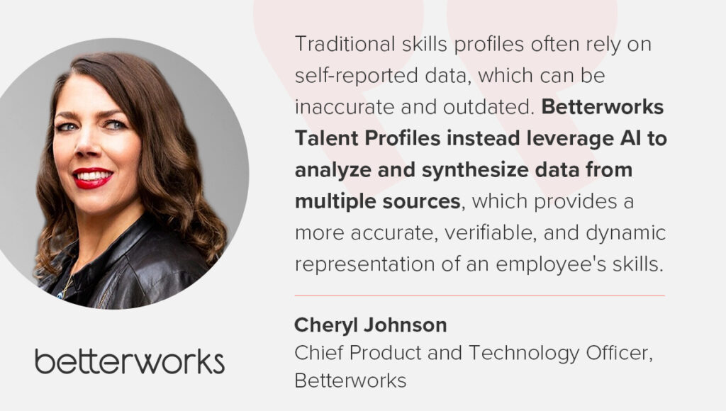 This innovation is particularly crucial as more organizations shift toward skills-based hiring and development. “Traditional skills profiles often rely on self-reported data, which can be inaccurate and outdated,” explains Cheryl Johnson, chief product and technology officer at Betterworks. “Betterworks Talent Profiles instead leverage AI to analyze and synthesize data from multiple sources, which provides a more accurate, verifiable, and dynamic representation of an employee’s skills​​.”