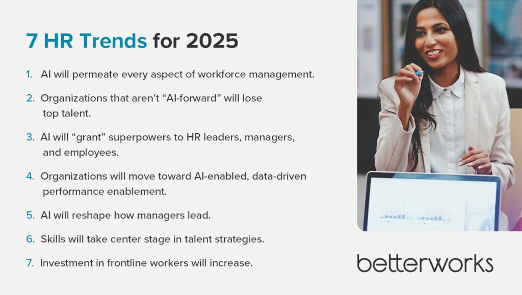 - Old-fashioned, backward-focused, and compliance-driven performance management and performance reviews: “The idea that performance management exists solely to evaluate past performance will be turned on its head in 2025,” says Betterworks CEO Doug Dennerline. “Organizations that stick to annual performance reviews risk disengaging employees and missing valuable development opportunities,” adds Betterworks VP of HR Transformation, Jamie Aitken.