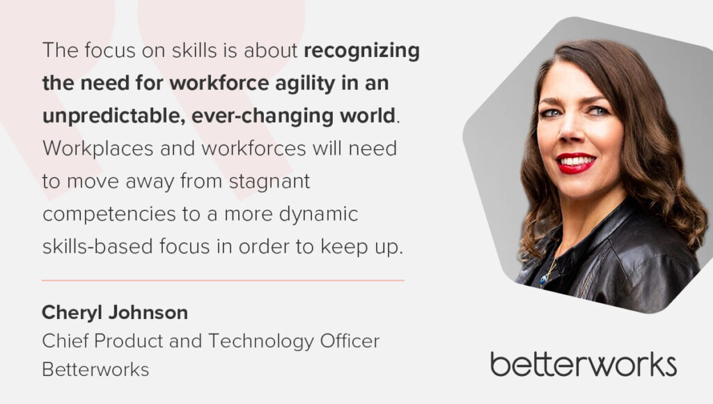 “The focus on skills,” Cheryl says, “is about recognizing the need for workforce agility in an unpredictable, ever-changing world. From global macroeconomic and geopolitical shifts to the rapid evolution of technology, the environment in which we operate is constantly transforming. Workplaces and workforces will need to move away from stagnant competencies to a more dynamic skills-based focus in order to keep up.”