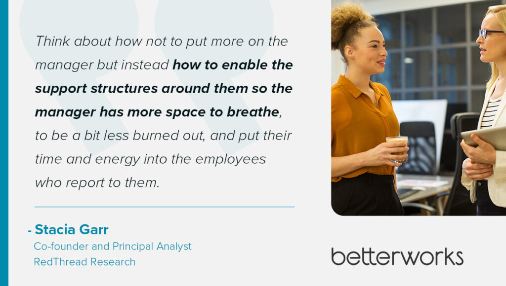 “Think about how not to put more on the manager but instead how to enable the support structures around them so the manager has more space to breathe, to be a bit less burned out, and put their time and energy into the employees who report to them,” Garr says.