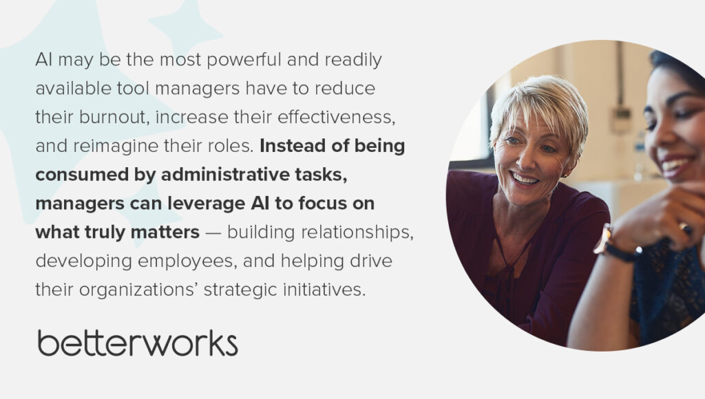 But here’s what is new: AI may be the most powerful and readily available tool managers have to reduce their burnout, increase their effectiveness, and reimagine their roles. Instead of being consumed by administrative tasks, managers can leverage AI to focus on what truly matters — building relationships, developing employees, and helping drive their organizations’ strategic initiatives.