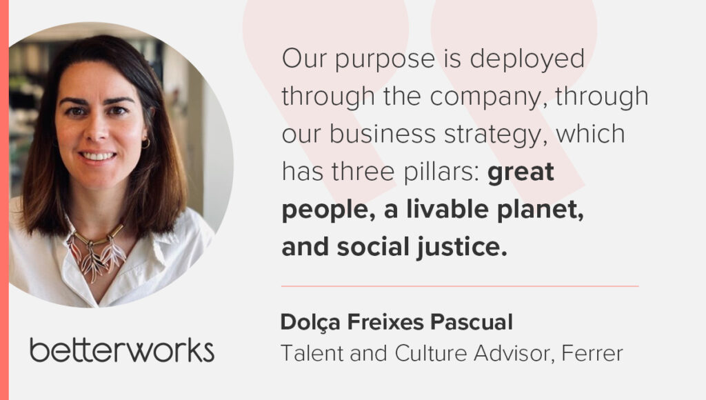 Ferrer, for example, is integrating its values into every aspect of organizational life, from decision-making to daily operations — an innovation that transforms the very fabric of the company. “Our purpose is deployed through the company, through our business strategy, which has three pillars: great people, a livable planet, and social justice,” she said.