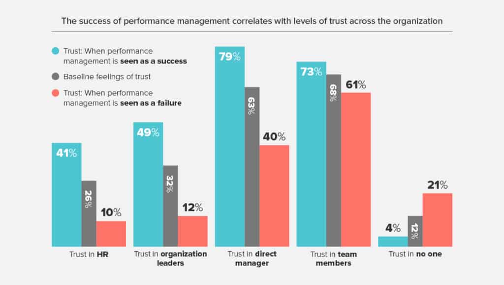 When employees view performance reviews as biased, trust in managers drops by 23%. Feelings of belonging also plummet, and employees are twice as likely to look for a job elsewhere — whether actively or passively. However, there is sunlight that borders the edges of this cloud: Trust in leadership, HR, and managers goes way up — by a factor of 2x to 4x — when employees see performance management as successful.