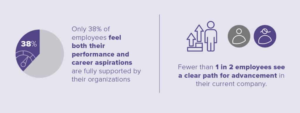 The report also reveals that internal career advancement and better skills development rank second and third on employees’ list of reasons to stay in their current roles. Yet, fewer than half of employees see a clear path to advance internally. And to complicate matters, the people they trust most — their managers — often don’t necessarily feel adequately equipped to coach employees for career development.