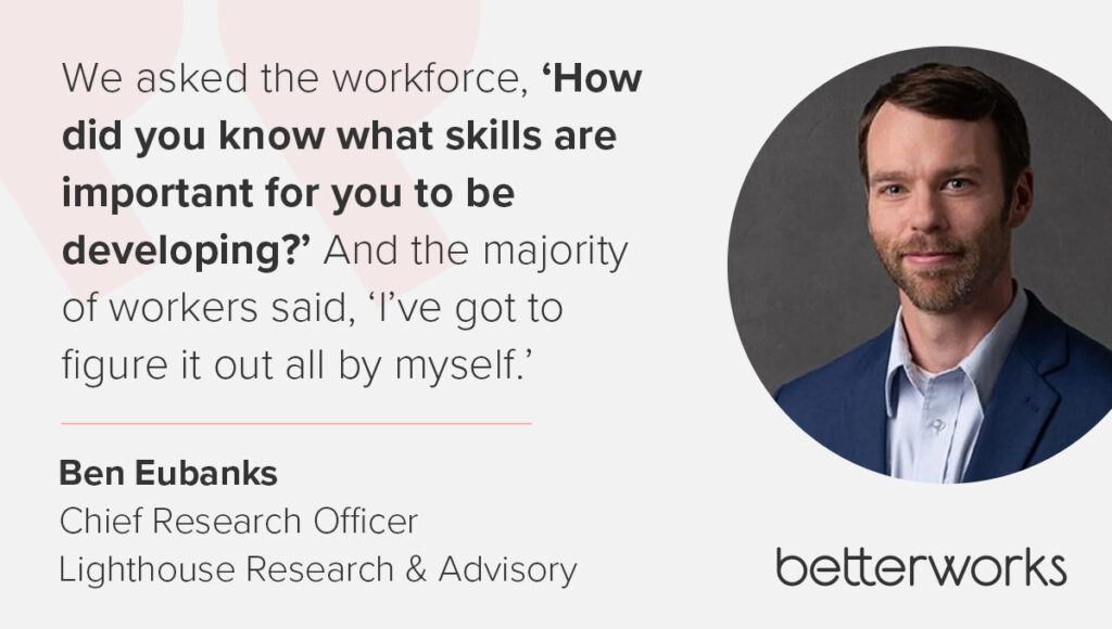 One of the most overlooked aspects of skills strategy is how organizations communicate about skills — if they communicate at all. Many HR leaders responding to a Lighthouse Research & Advisory survey reported that they communicate about skills through managers, Ben said, yet employees often feel left in the dark. “We asked the workforce, ‘How did you know what skills are important for you to be developing?’” Ben said. “And the majority of workers said, “I’ve got to figure it out all by myself.’”
