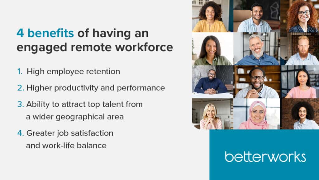 One of the biggest advantages of engaging a remote workforce is that it can help you retain your best employees. Engaged employees are more invested in their work and the team. And when your employees feel valued and supported, they’re more likely to stick around — even if they have high earning potential elsewhere.