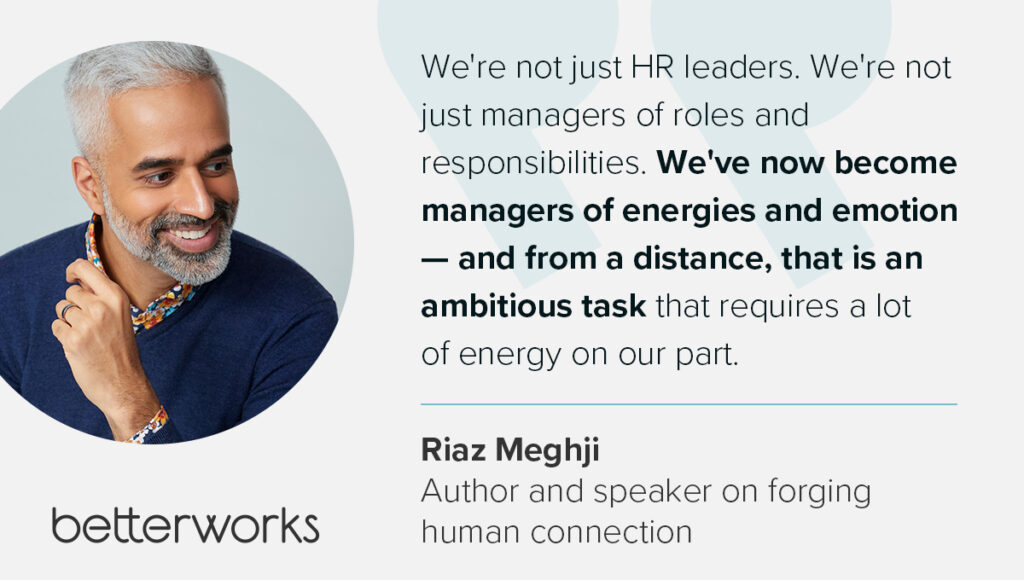 Recognizing and addressing the emotional needs of your team is crucial for maintaining a healthy and productive work environment. “We’re not just HR leaders. We’re not just managers of roles and responsibilities,” Riaz says. “We’ve now become managers of energies and emotion — and from a distance, that is an ambitious task that requires a lot of energy on our part.”