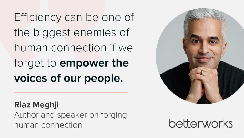 In the quest for productivity, it’s easy to prioritize speed and output over meaningful interactions. “Efficiency can be one of the biggest enemies of human connection if we forget to empower the voices of our people,” Riaz says. However, true efficiency isn’t just about getting things done quickly; it’s also about creating an environment where employees feel valued and connected.