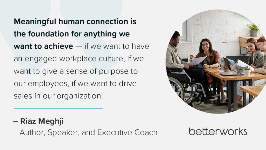“Meaningful human connection is the foundation for anything we want to achieve — if we want to have an engaged workplace culture, if we want to give a sense of purpose to our employees, if we want to drive sales in our organization,” Riaz says. “I don’t believe we can motivate, persuade, or influence anyone unless we connect with them first.”