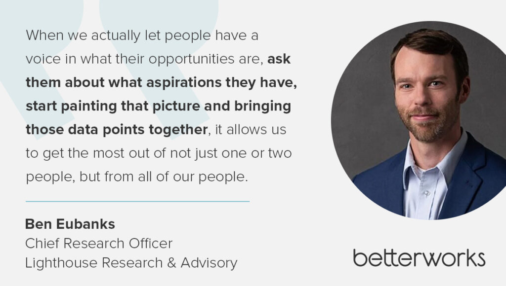 “When we actually let people have a voice in what their opportunities are, ask them about what aspirations they have, start painting that picture and bringing those data points together, it allows us to get the most out of not just one or two people, but from all of our people,” he says.