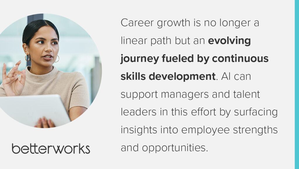 Career growth is no longer a linear path but an evolving journey fueled by continuous skills development. AI can support managers and talent leaders in this effort by surfacing insights into employee strengths and opportunities. “This gives managers insights so they know where to plug their people in: the projects, the tasks, the training, the things that make them come to life,” Ben says.
