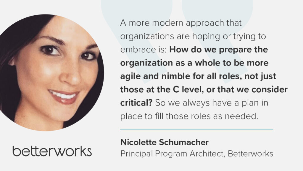 Traditionally, succession planning has focused on identifying top talent for senior leadership roles. But modern organizations are moving towards a more holistic and effective leadership succession planning approach, preparing for transitions at all levels of the organization. “I think it’s merged a bit now, where we’re at today,” says Betterworks Principal Program Architect Nicolette Schumacher. “A more modern approach that organizations are hoping or trying to embrace is: How do we prepare the organization as a whole to be more agile and nimble for all roles, not just those at the C level, or that we consider critical? So we always have a plan in place to fill those roles as needed.”