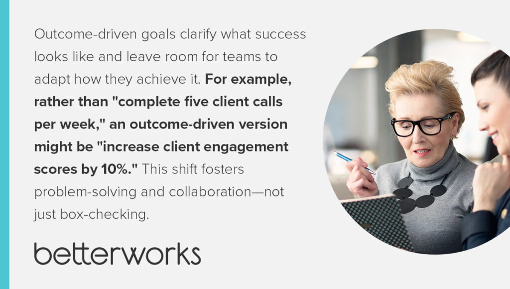 Avoid checklist thinking. When teams only focus on activity, it’s easy to miss the bigger picture. Outcome-driven goals clarify what success looks like and leave room for teams to adapt how they achieve it. For example, rather than “complete five client calls per week,” an outcome-driven version might be “increase client engagement scores by 10%.” This shift fosters problem-solving and collaboration—not just box-checking.