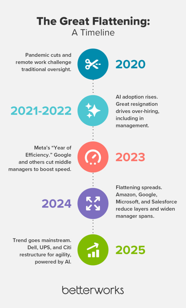 Across industries, companies are cutting layers of management in pursuit of speed and efficiency. The movement — dubbed The Great Flattening — promises leaner teams and more empowered employees.