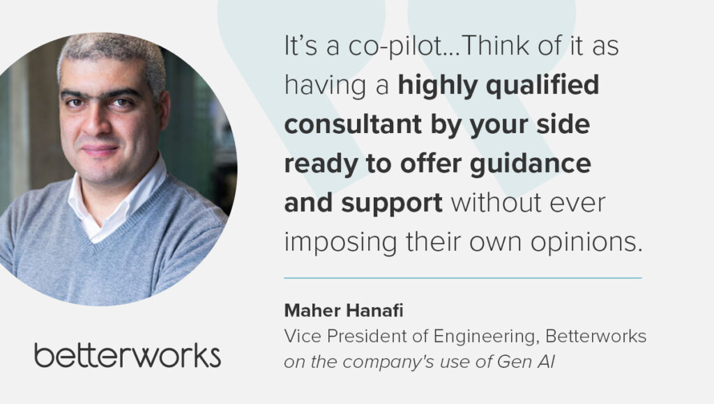 Betterworks’ AI isn’t intended to replace humans, but to enhance what you’re capable of achieving. “It’s a co-pilot,” Maher said. This human-centered approach ensures that AI remains a supportive tool, rather than a replacement for human decision-making. “Think of it as having a highly qualified consultant by your side ready to offer guidance and support without ever imposing their own opinions,” Maher continued.
