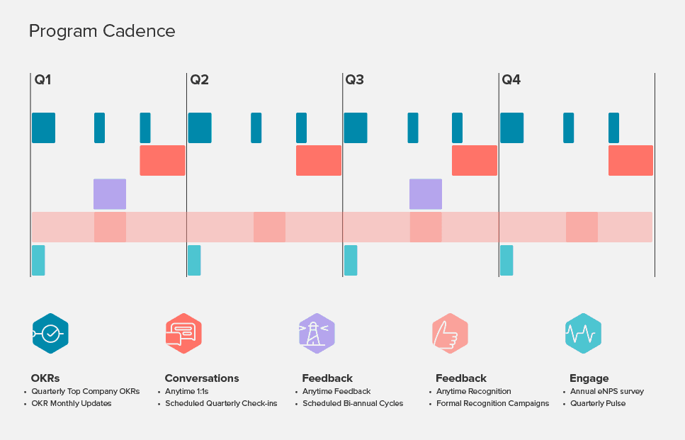 The cadence of a mid-quarter check-in we found to be timely, specific, and relevant. Approaching OKRs as editable helped to keep employees motivated and engaged. The check-in provided employees with the opportunity to talk about with their managed and make necessary adjustments to ensure they are successful in what they’re trying to achieve. It also was a good opportunity for managers to support employees and help them work through or roadblocks.