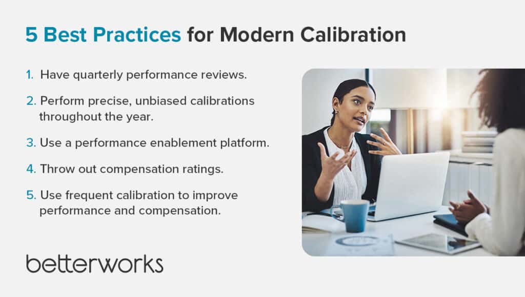 - Use a performance enablement platform that facilitates the shift from traditional review practices to modern ones. Using Betterworks, calibrations aggregate rich performance data into clear, impartial insights about employee performance at a glance. With it, you can make timely and fair data-driven talent decisions anytime, not just during the year-end appraisal process.